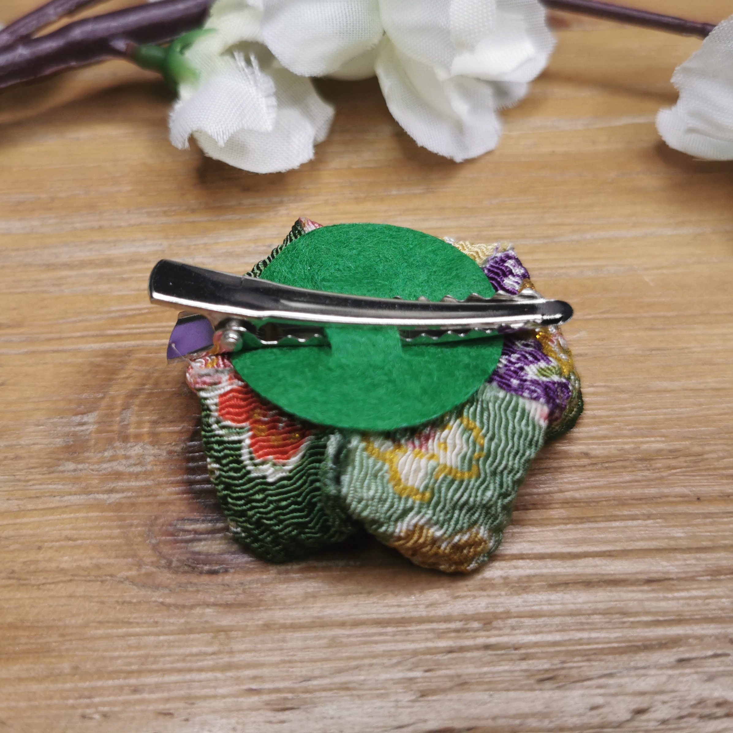 Pince à cheveux fleur en tissu chirimen en forme de fleur de cerisier (sakura) de couleur verte à motifs avec des dorures.